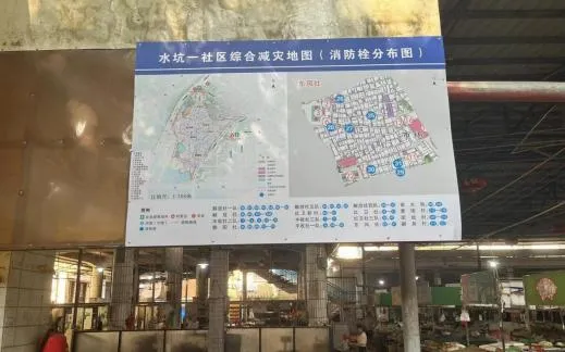 ▲水坑一社区在菜市场等位置显眼、人流密集的点位张贴综合减灾示意图,全面提升“风险广知晓、灾中快避险”的能力水平