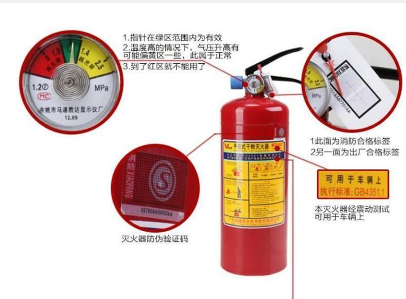 使用方法:使用时记住四字口诀“提 、拔、握、压”。提起灭火器摇一摇,上下颠倒几次,使里面的干粉松动,拔出灭火器的保险销,握住喷嘴对准火焰根部,保持适当距离,按压手柄喷射。