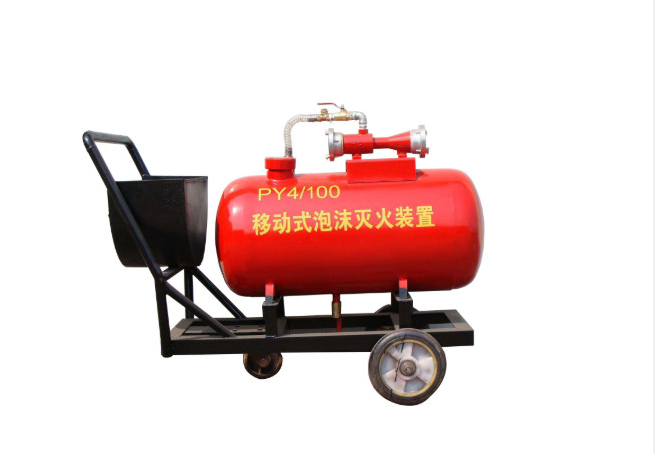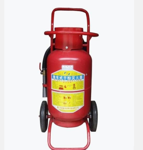 4、推车式干粉灭火器:这类灭火器移动方便,操作简单,灭火效果强大。适用在扑灭易燃液体和电器设备等引起的大面积火灾。